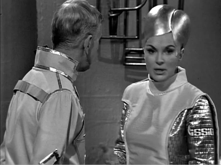 The Star Trek influence here is palpable, but only in design and plot. The crew of the V-ship are mostly interchangeable stiffs. Hermack is stolid—I can’t help but think he’s reading all his lines from cue cards. Warne and Penn don’t seem to have any distinctive qualities, apart from their accents, and they don’t do much in the way of problem solving. This might be based on the crew of the Enterprise, but it sure doesn’t taste the same.
